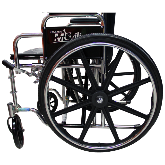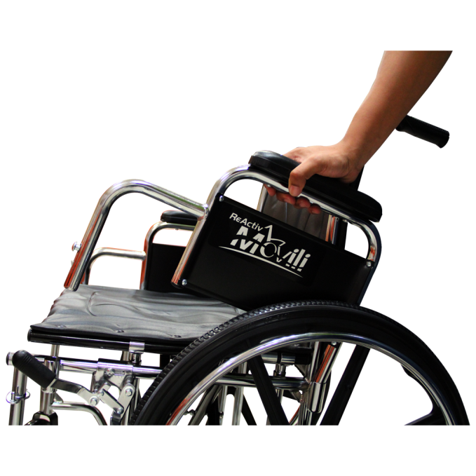 - Llanta delanteras de 8″ y traseras de 24″ semiautomáticas con rines MAG negros y aros motrices de acero cromado tipo automotriz al igual que el chasis de la silla de ruedas